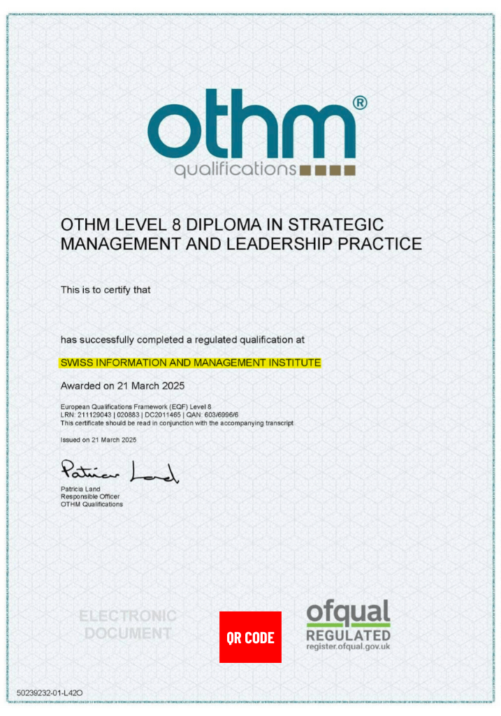 You are recognised as having achieved RQF Level 8 (doctorate-level in terms of competence), as acknowledged by the UK education authorities, reflecting expert-level and executive-level professional capability in the workplace.