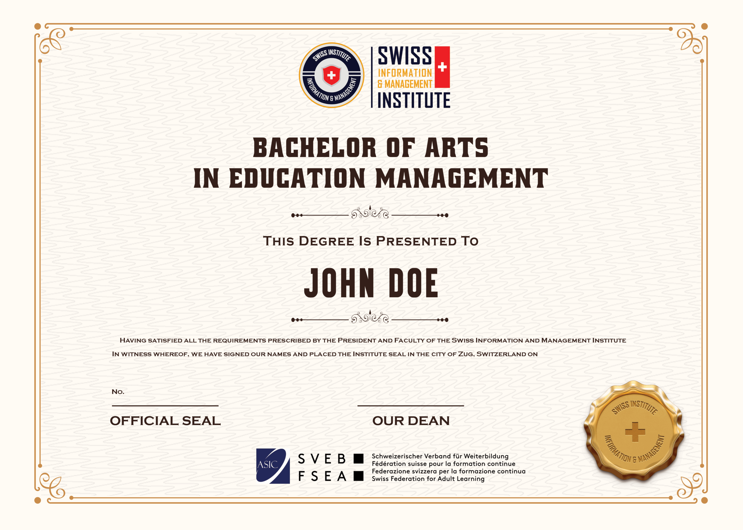 - Bachelor of Arts in Education Management – awarded by SIMI Swiss (Switzerland)