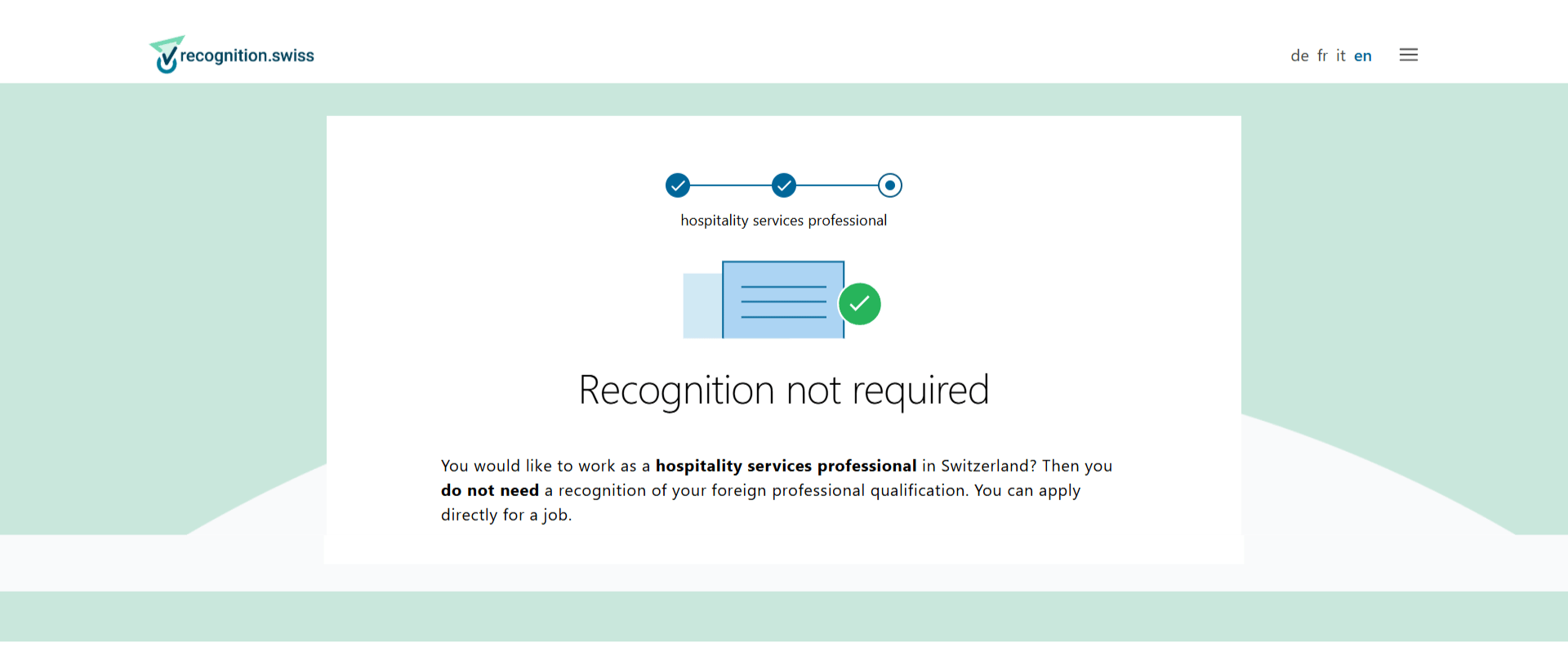 The SwissUK degree awarded by SIMI is recognised for employment in Switzerland without any additional procedures, as the position of Hospitality Services Professional belongs to the group of occupations that do not require a professional licence.