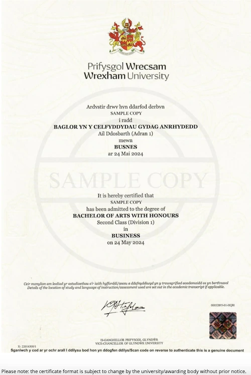 - Bachelor of Arts with Honours in Business and Management from Wrexham University (UK Public University)