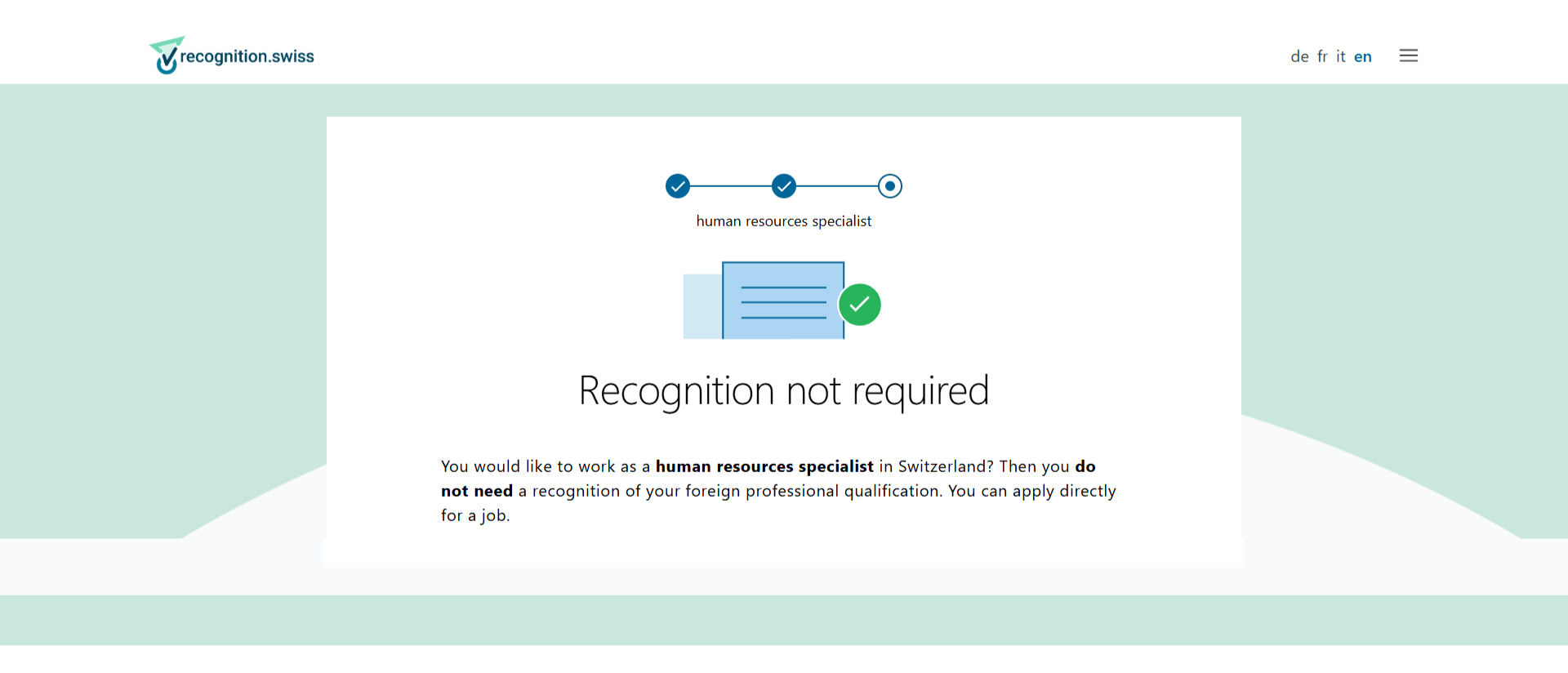 The SwissUK degree awarded by SIMI is recognised for employment in Switzerland without any additional procedures, as the position of Human Resources Specialist belongs to the group of occupations that do not require a professional licence.