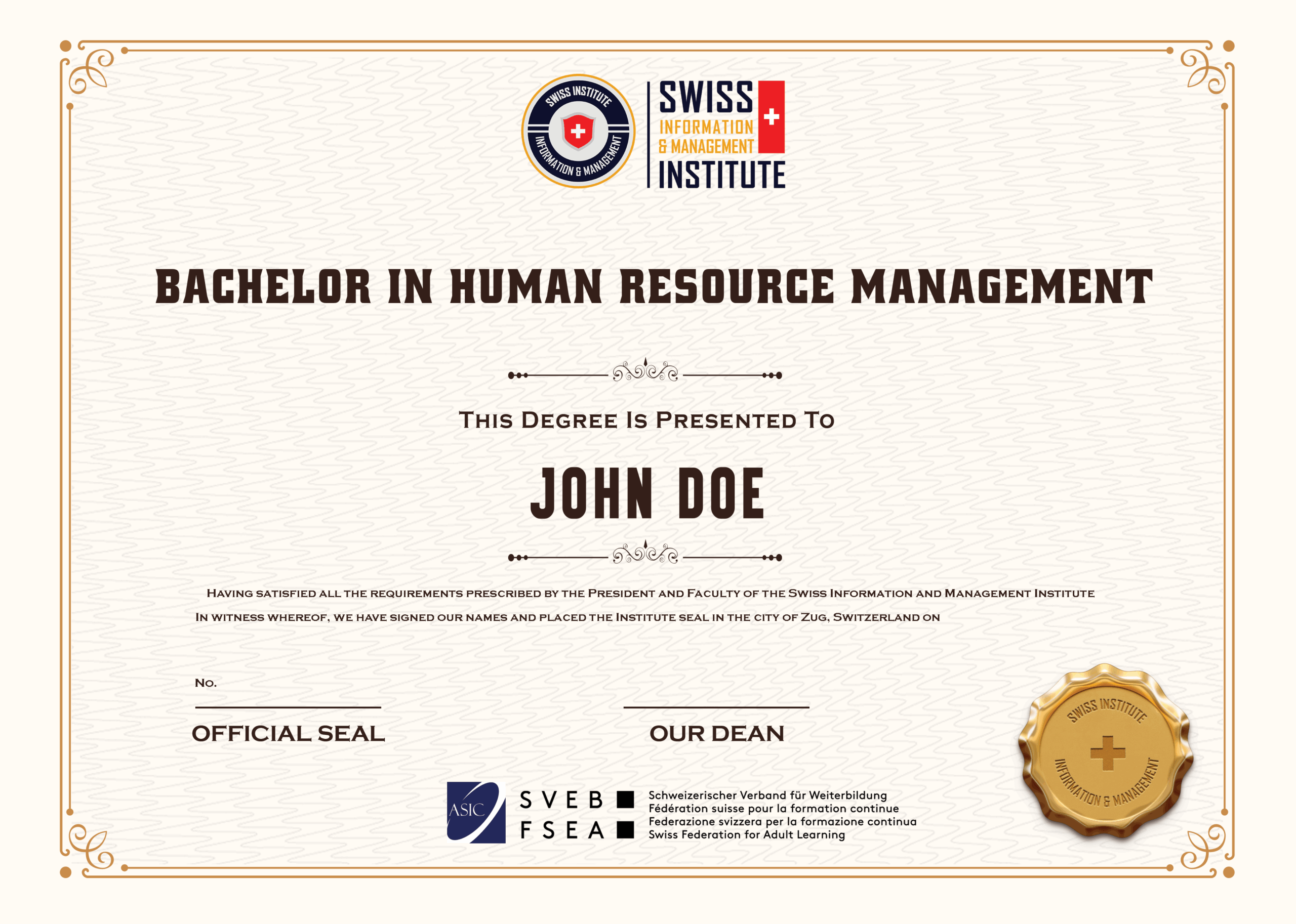 - Bachelor of Human Resource Management – awarded by SIMI Swiss (Switzerland)