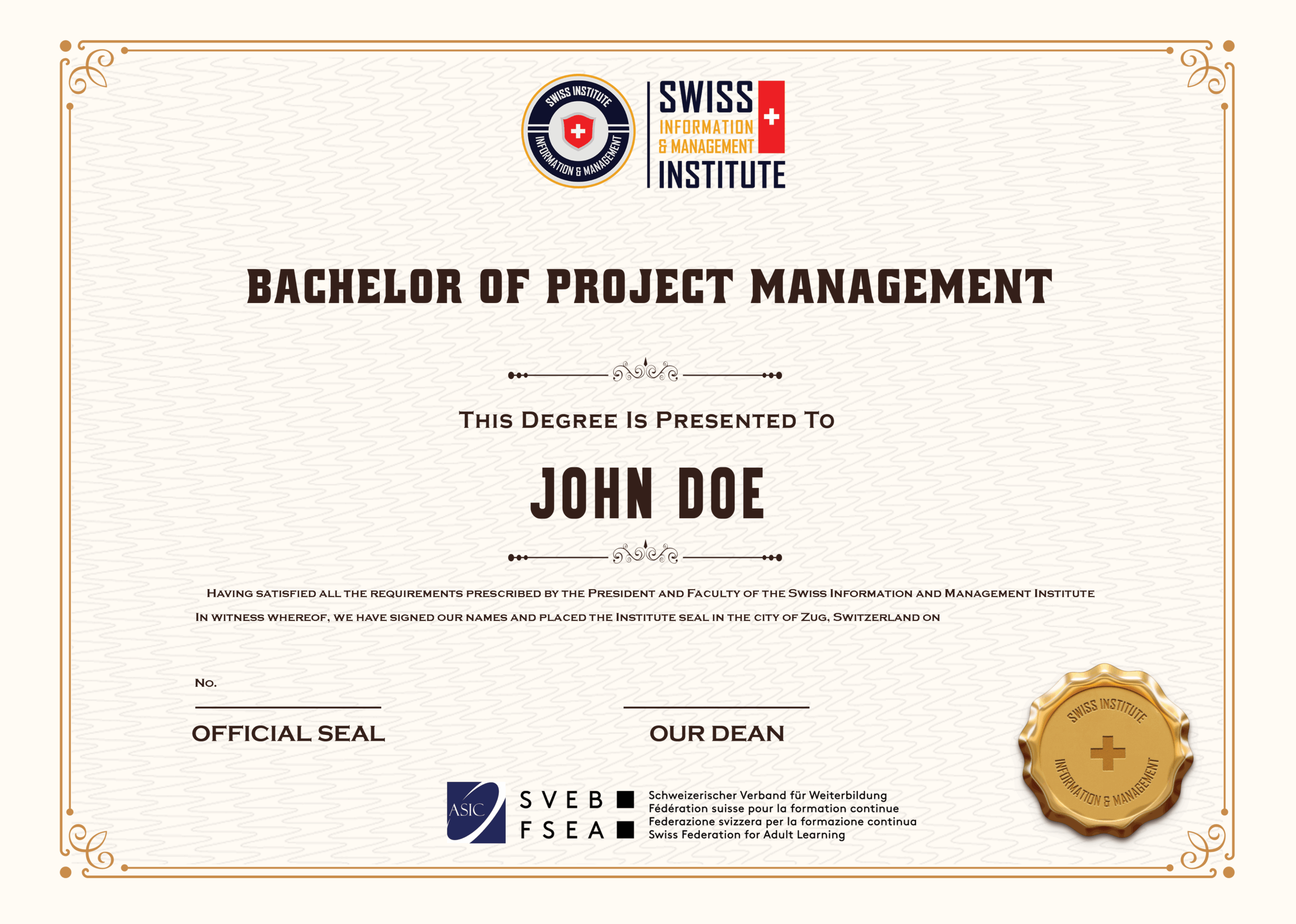 - Bachelor of Project Management – awarded by SIMI Swiss (Switzerland)