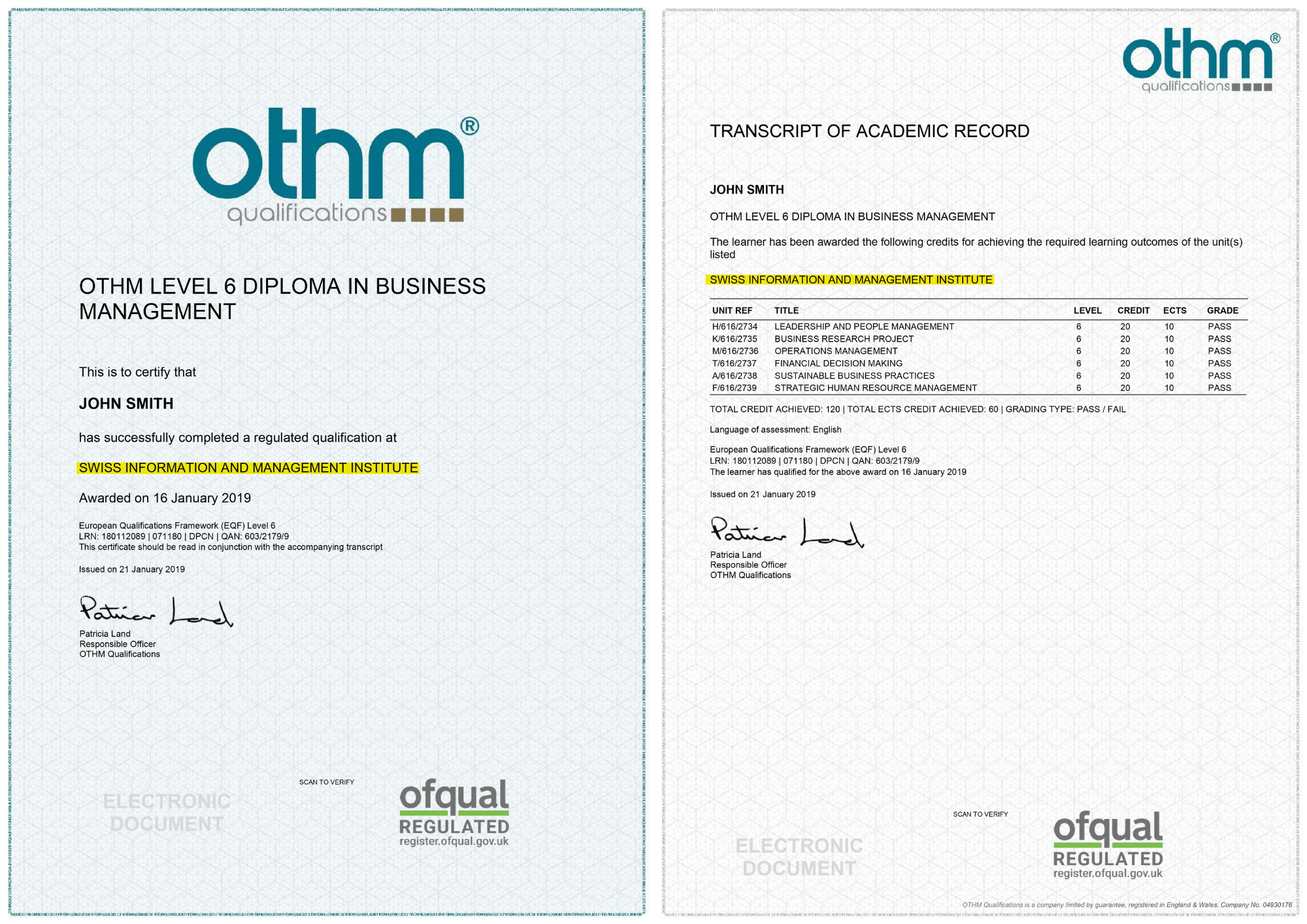 - Reference with sample diploma and transcript of OTHM Level 6 Diploma in Business Management HERE