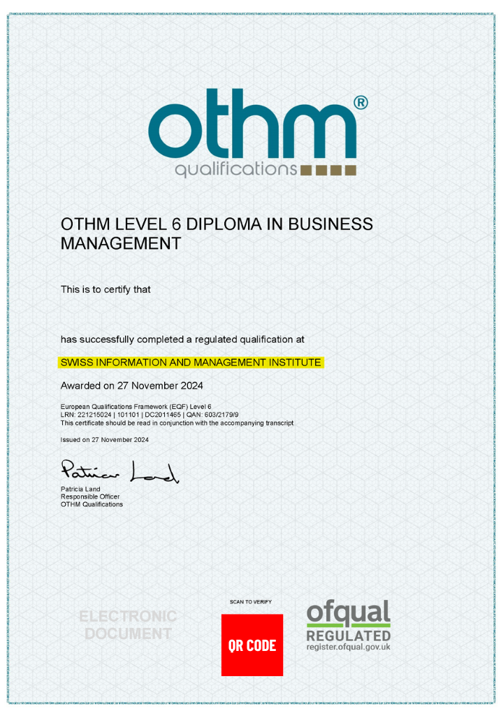 - Level 6 Diploma in Business Management awarded by OTHM (recognised by Ofqual, UK Government)