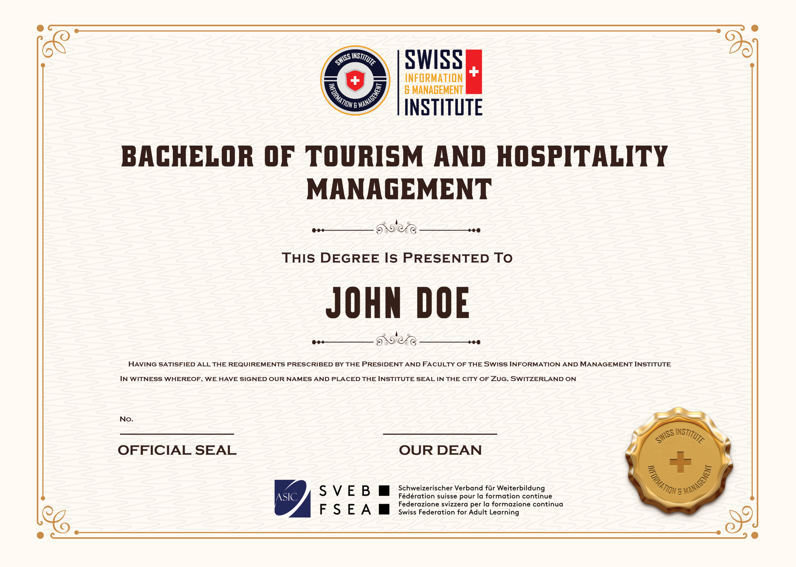 • Bachelor of Tourism and Hospitality Management – awarded by SIMI Swiss (Switzerland)