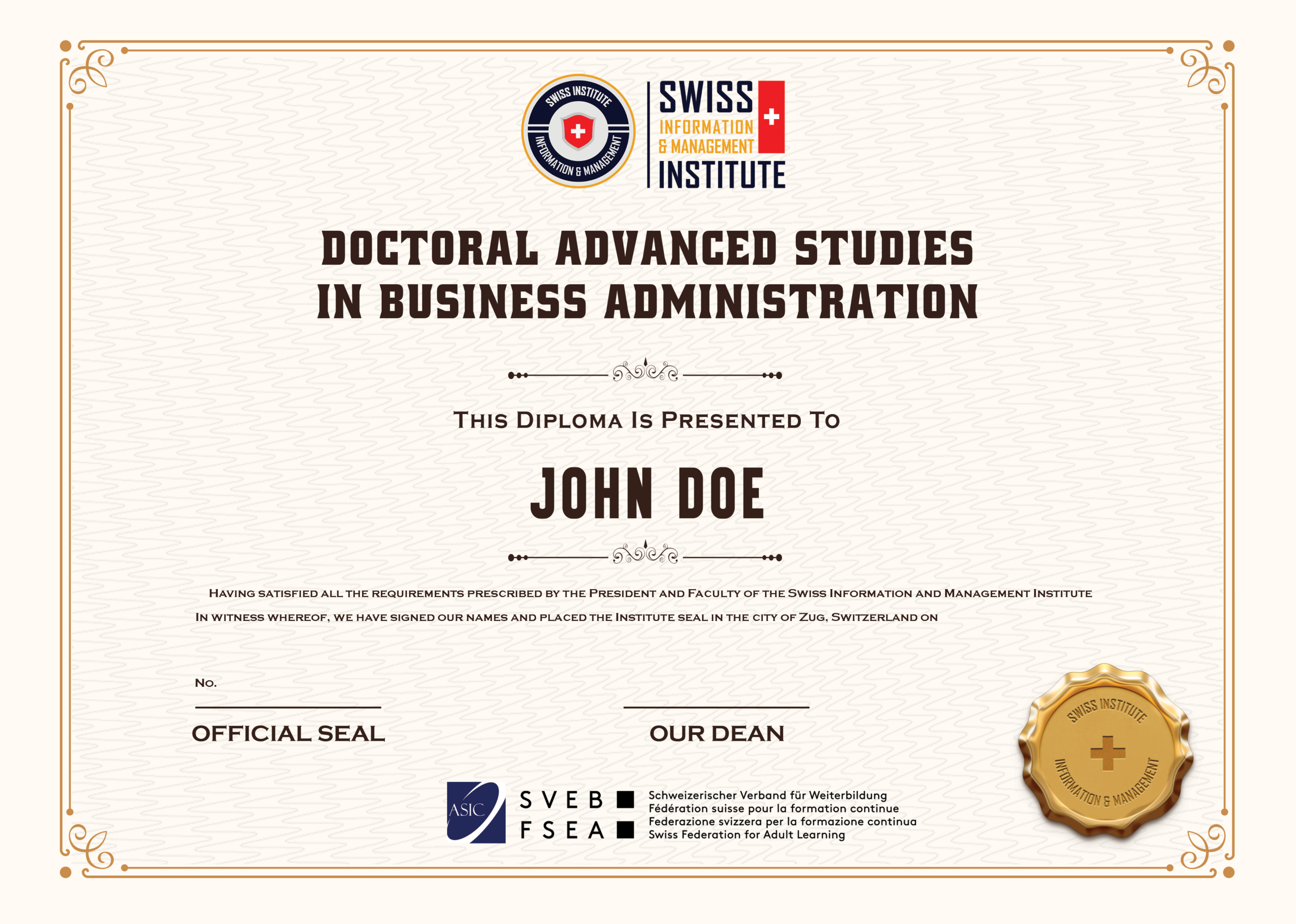• Sample degree for the Doctoral Advanced Studies in Business Administration from SIMI Swiss HERE.