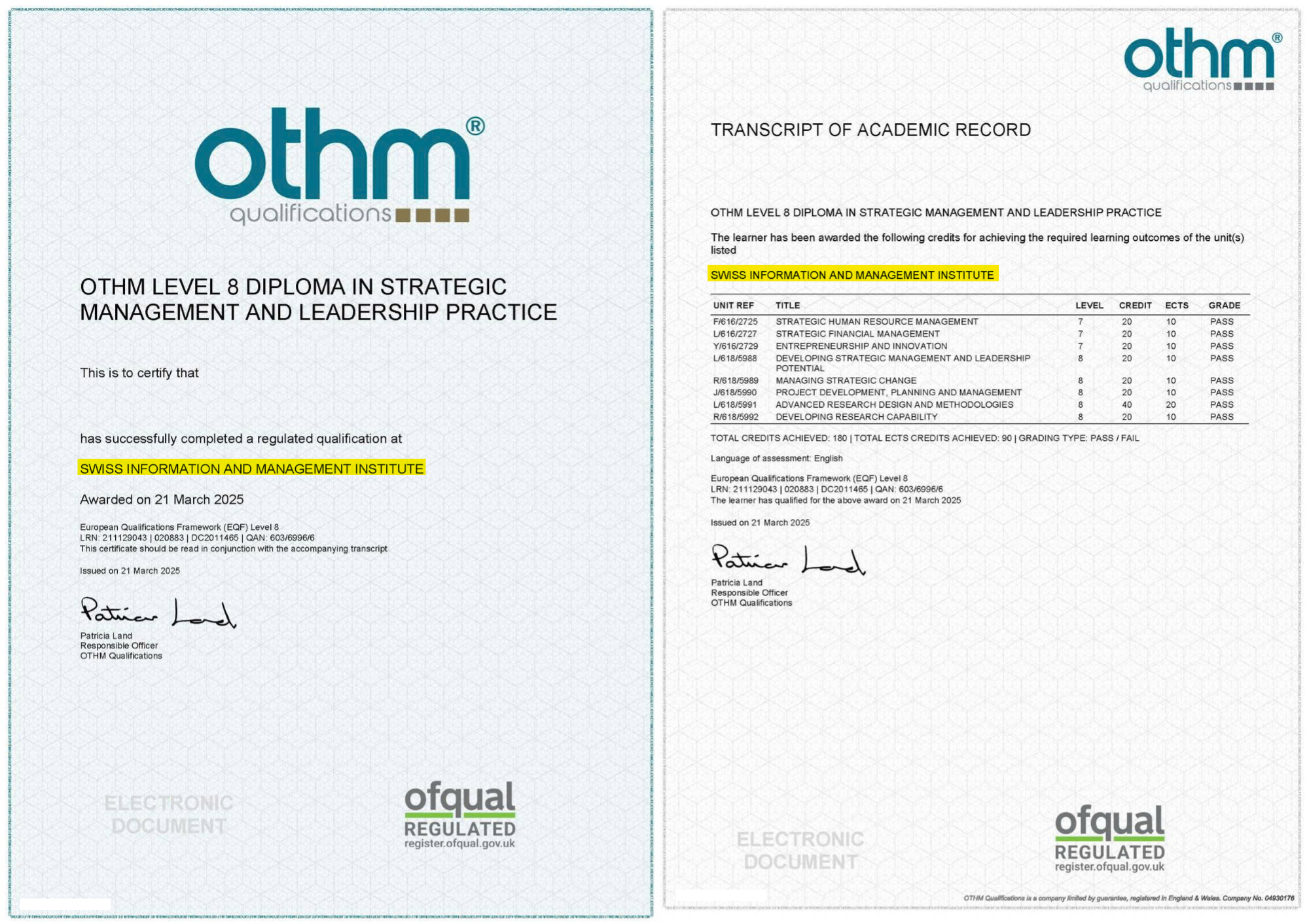 • Level 8 Diploma in Strategic Management and Leadership Practice from OTHM (UK government-recognized, positioned at UK ENIC/NARIC Band 14).