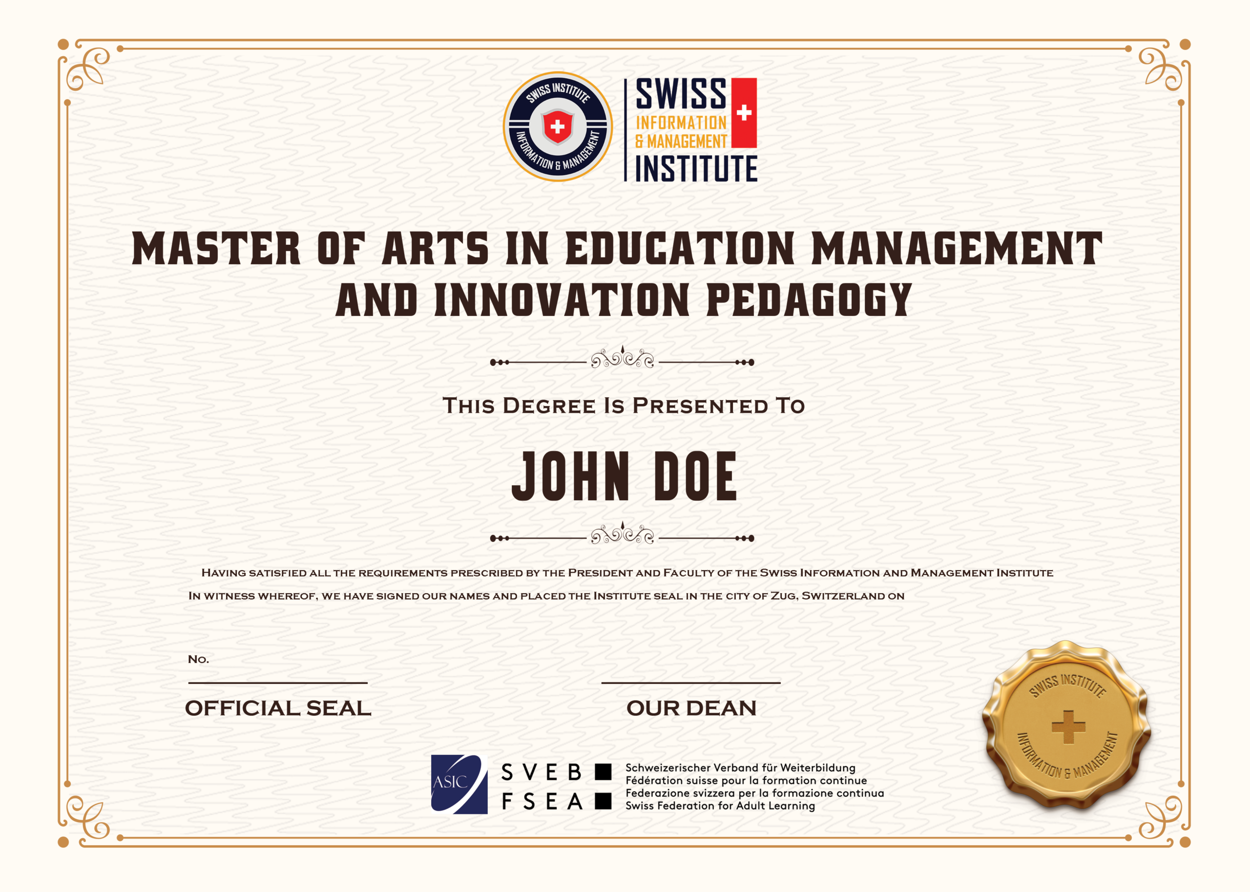 - Master of Arts in Education Management and Innovation Pedagogy from SIMI Swiss.