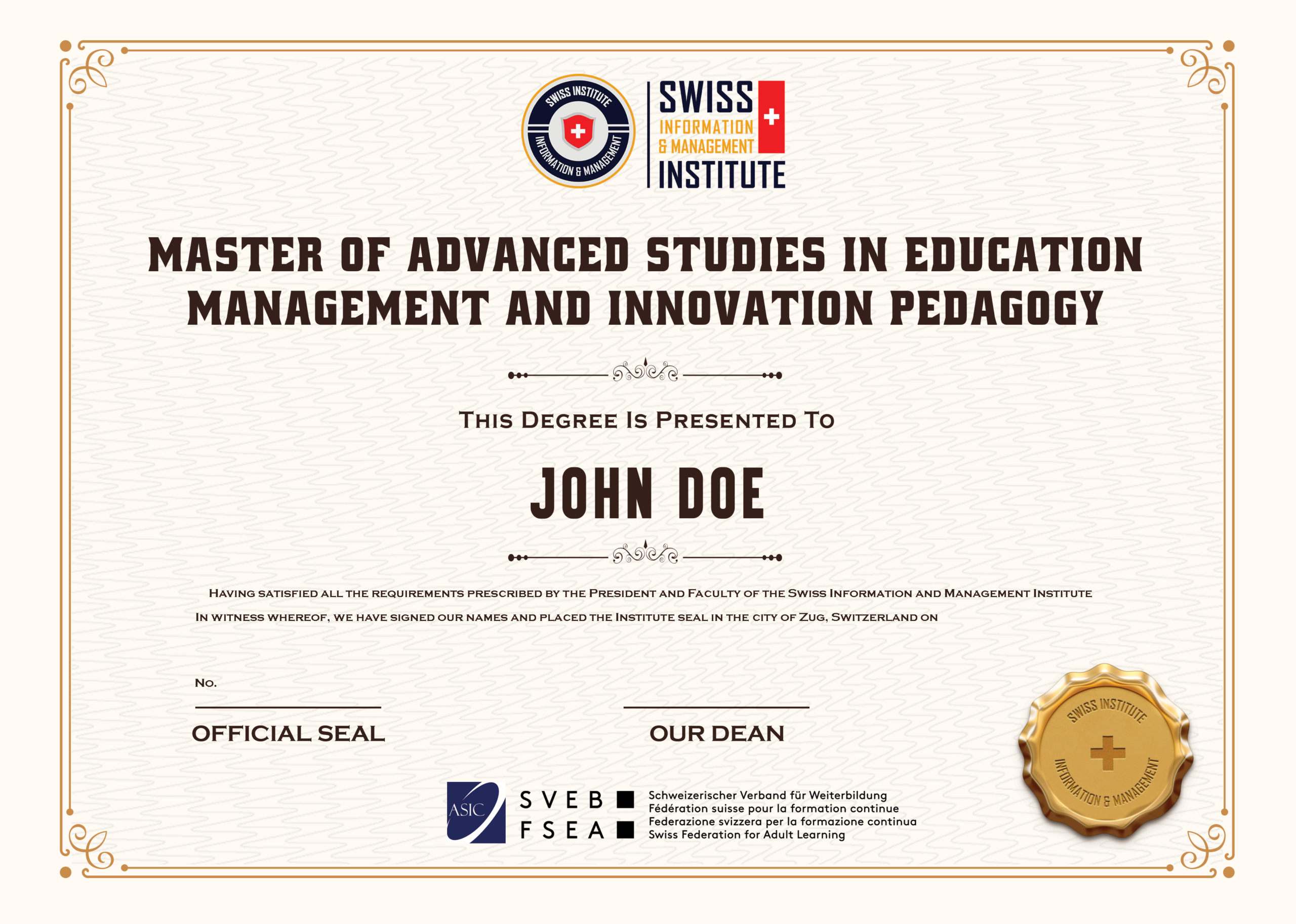 • Sample degree for the Master of Advanced Studies in Education Management and Innovation Pedagogy from SIMI Swiss HERE.