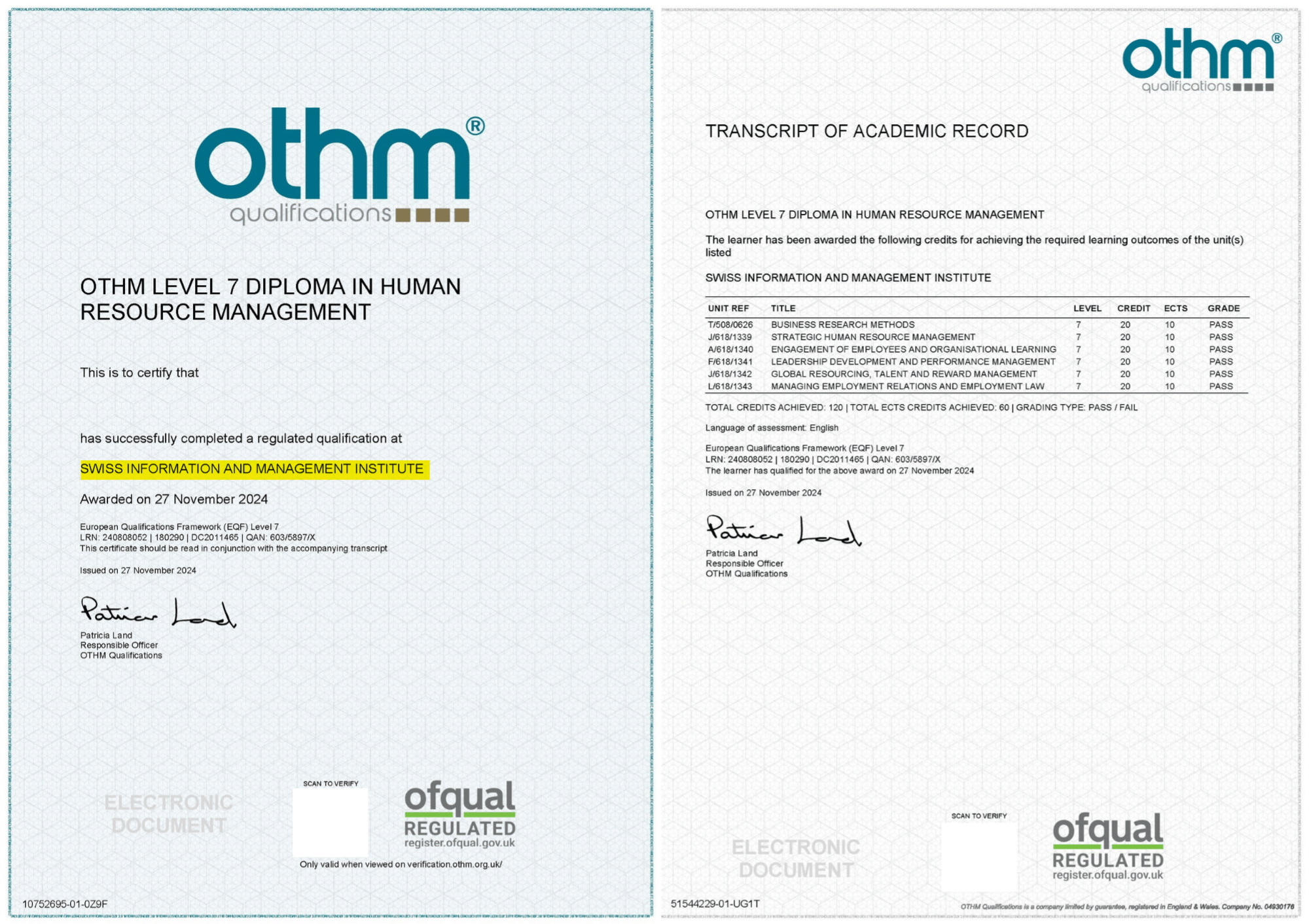 - Level 7 Diploma in Human Resource Management from OTHM (UK government-recognized, equivalent to a Master’s degree in the UK ENIC/NARIC Band 12).