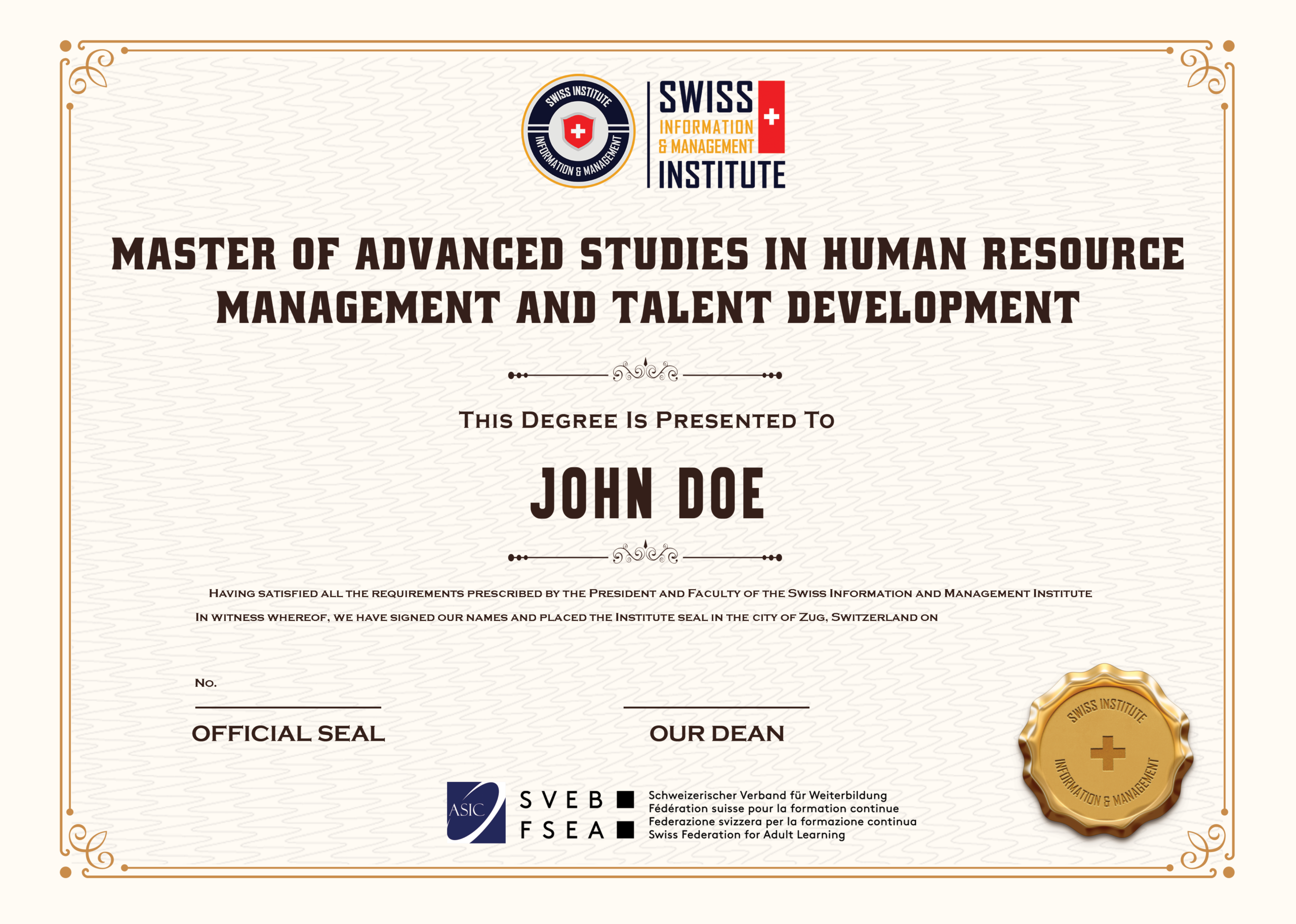 - Master of Advanced Studies in Human Resource Management and Talent Development – awarded by SIMI Swiss (Switzerland)