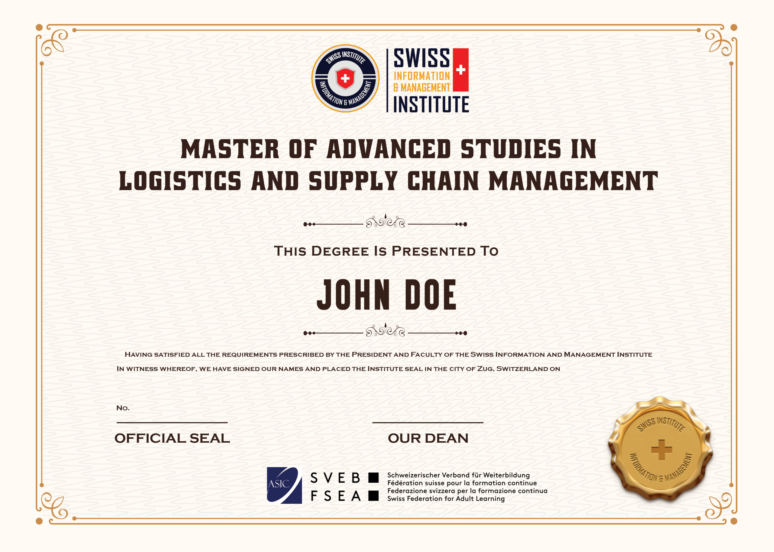 - Master of Advanced Studies in Logistics and Supply Chain Management – awarded by SIMI Swiss (Switzerland)