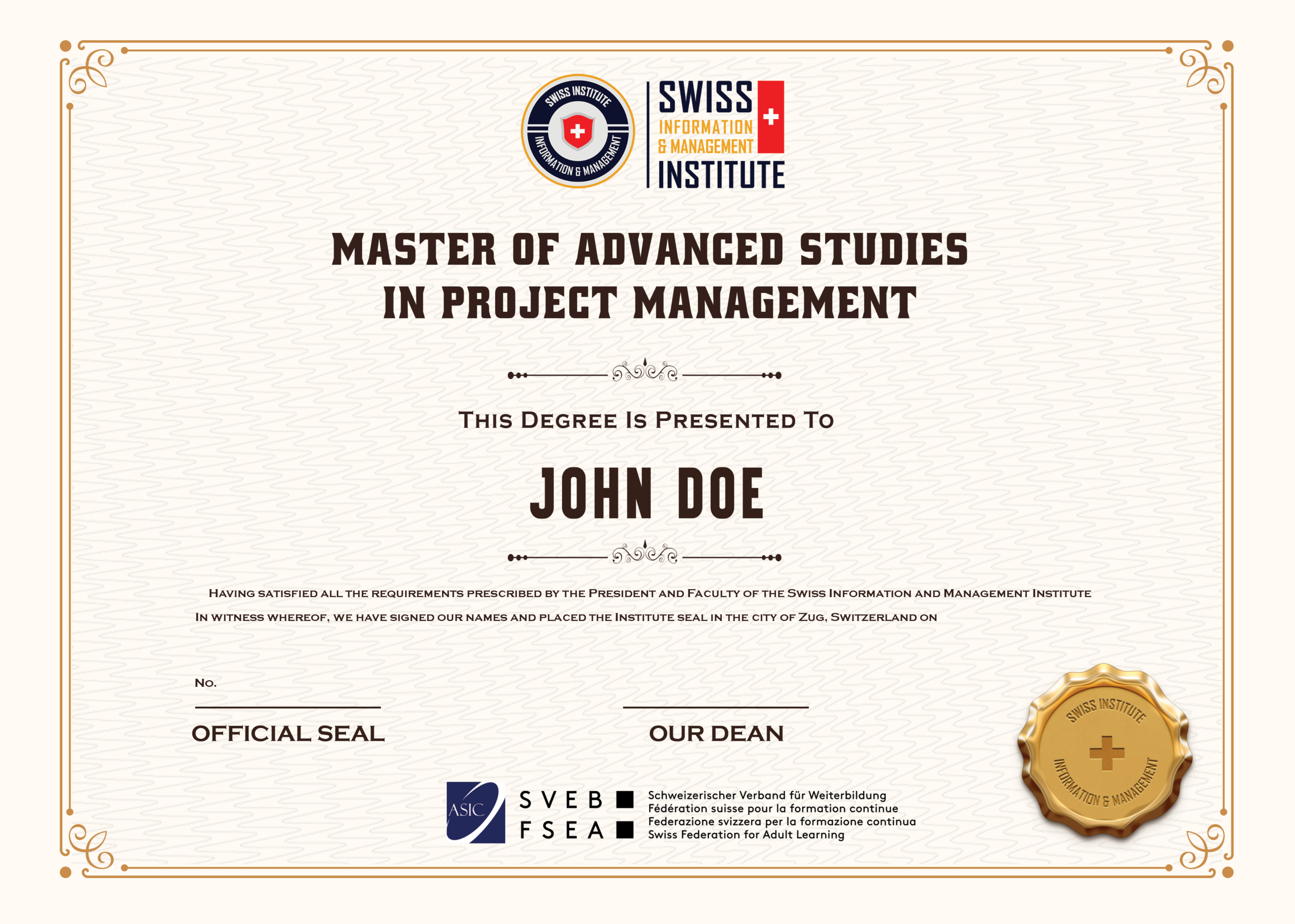 - Master of Advanced Studies in Project Management – awarded by SIMI Swiss (Switzerland)