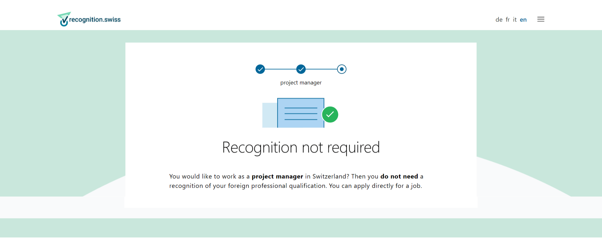 The SwissUK degree awarded by SIMI is recognised for employment in Switzerland without any additional procedures, as the position of Project Manager belongs to the group of occupations that do not require a professional licence.