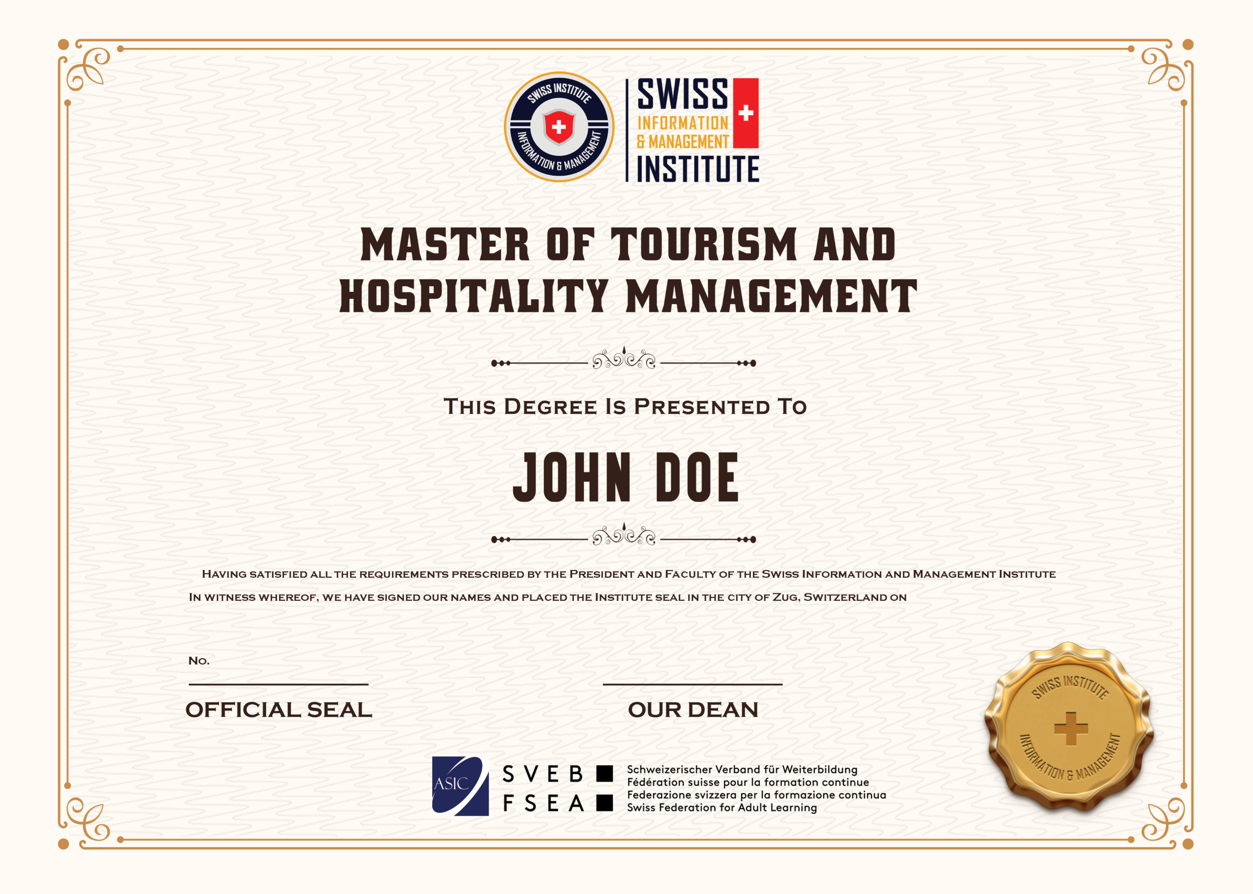 • Sample degree for the Master of Tourism and Hospitality Management from SIMI Swiss HERE.