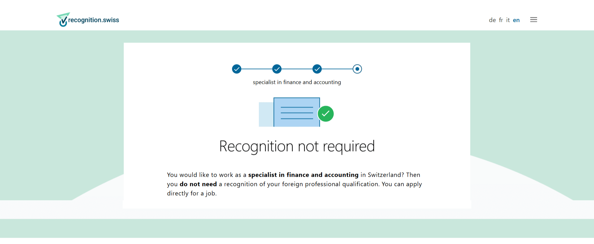 The SwissUK degree awarded by SIMI is recognised for employment in Switzerland without any additional procedures, as the position of Specialist in Finance and Accounting belongs to the group of occupations that do not require a professional licence.