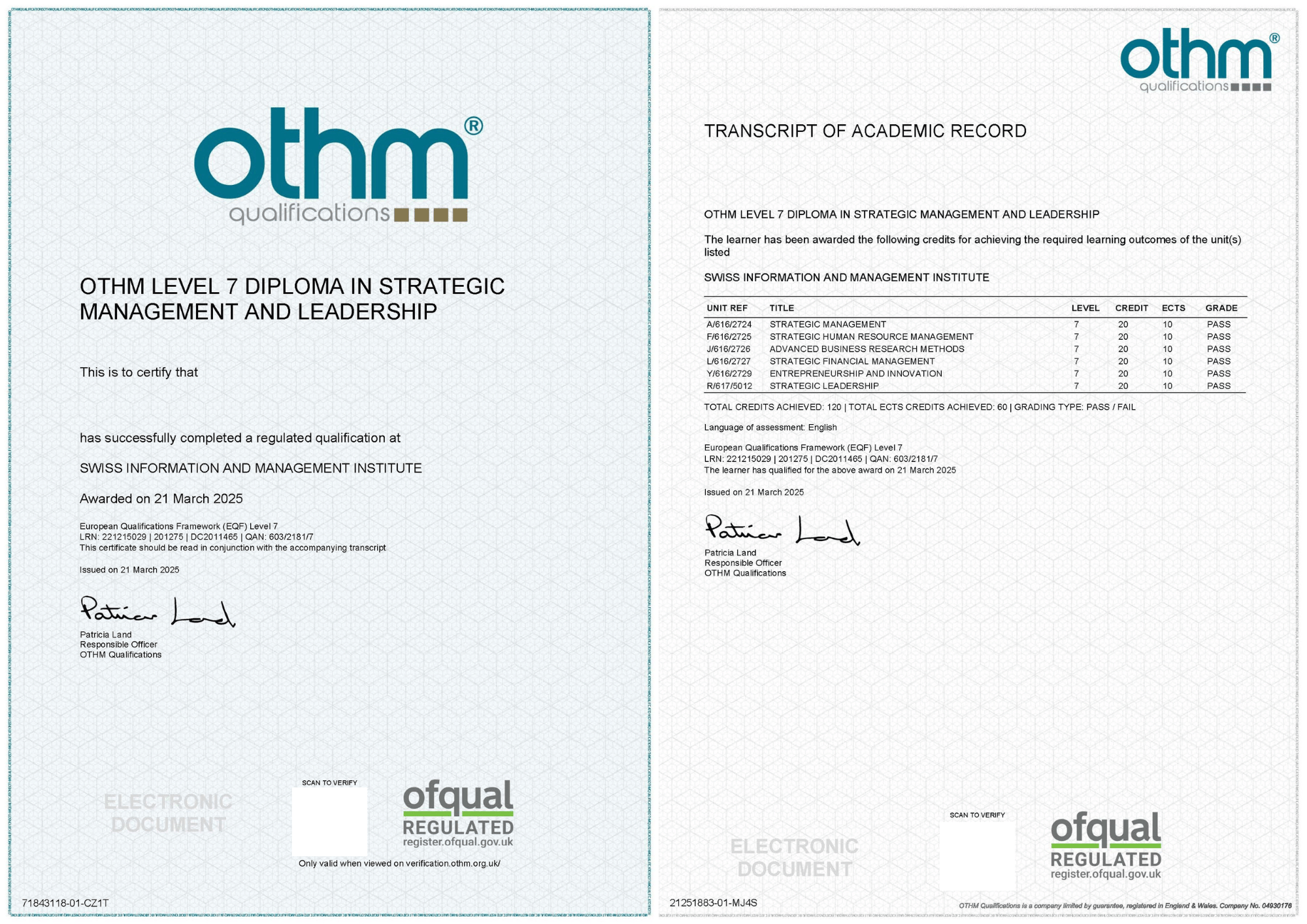 • Sample diploma and transcript of OTHM Level 7 Diploma in Strategic Management and Leadership HERE